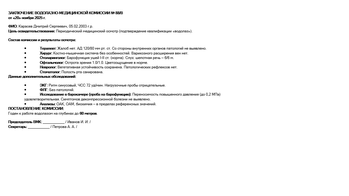 Образец медицинской водолазной комиссии