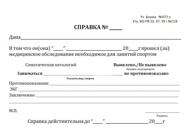 Прежде чем приступить к спортивным занятиям взрослым и детям нужно пройти медицинское обследование, чтобы убедиться в отсутствии противопоказаний. В ходе осмотра врачи определяют, есть ли у человека острые или хронические заболевания. Мы выдаем заключение в виде справки для занятий спортом по форме 073у. Работаем по лучшим ценам в Санкт-Петербурге.