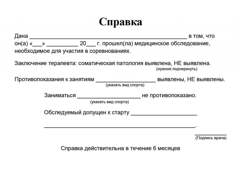 Требования к форме справки могут различаться. Некоторые организаторы принимают простое заключение терапевта, другие запрашивают расширенное обследование с ЭКГ.