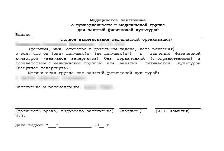 После завершения всех процедур медицинская комиссия выдаст документ с указанием группы здоровья для занятий физической культурой. В бланке будет указана фамилия, имя и отчество, название медицинского учреждения, данные врача, проводившего обследование и заключение медицинской комиссии. Срок действия полученного заключения составляет один месяц.